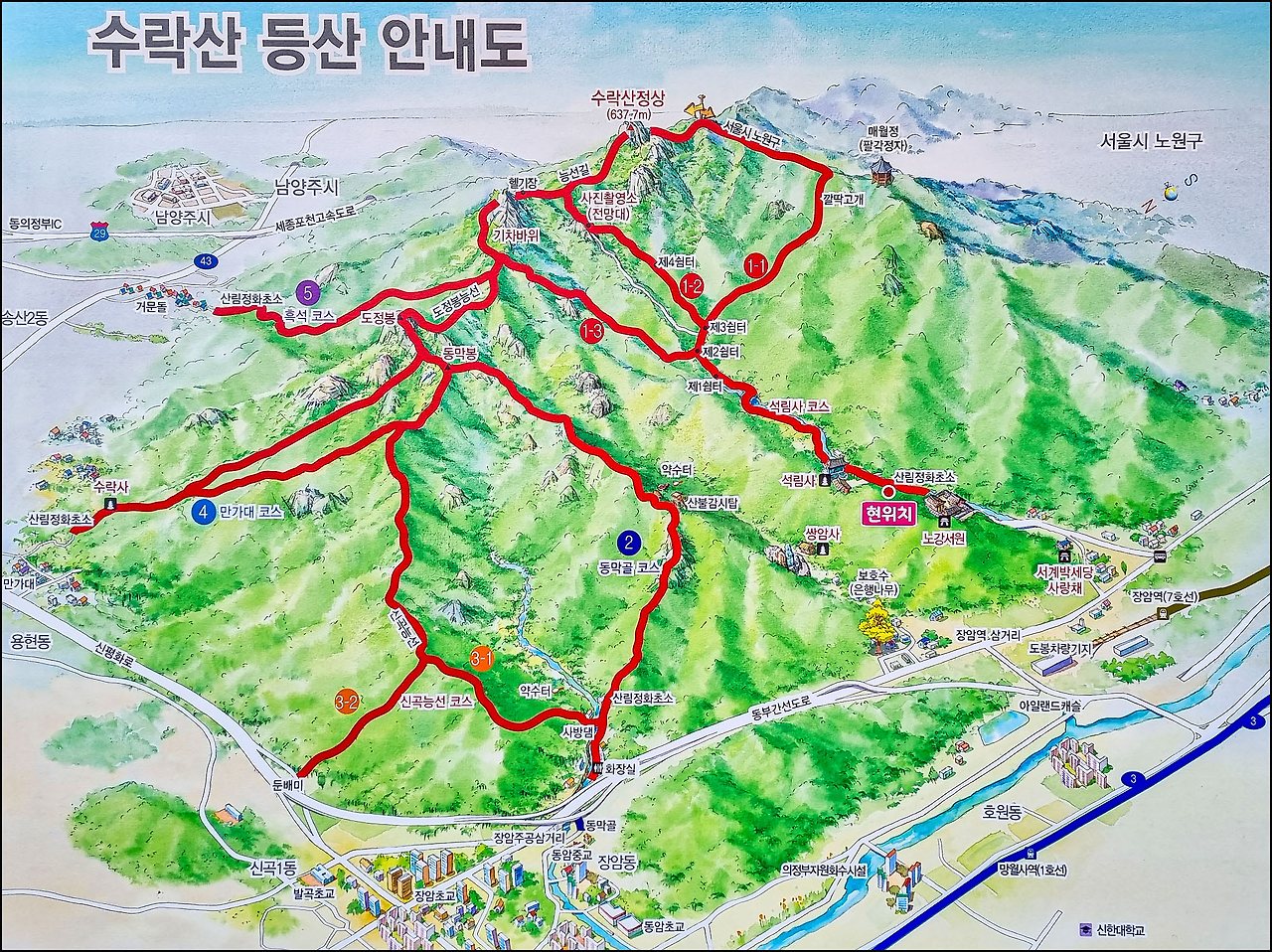 수락산 등산지도는 등산로 초입 관리소, 지하철 입구, 서울시·구청·공원 홈페이지, 블로그, 모바일앱 등에서 무료로 받을 수 있습니다.