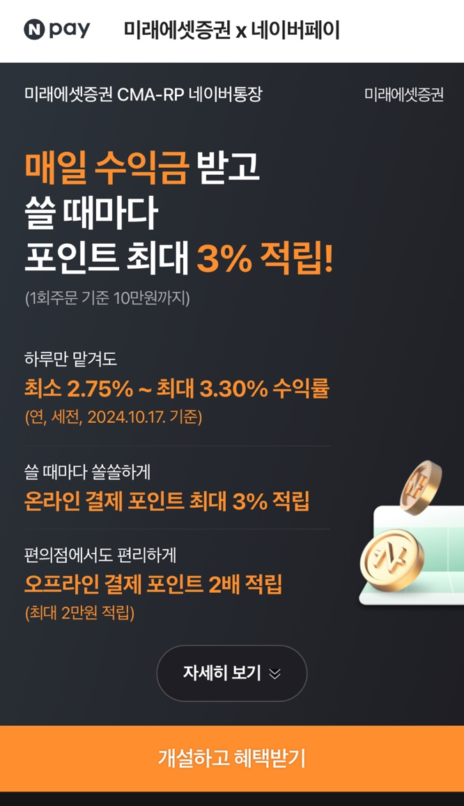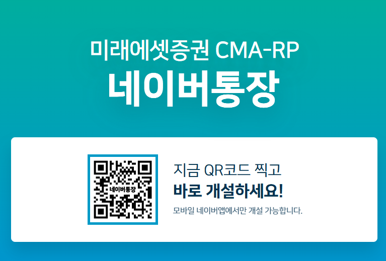미래에셋증권 CMA-RP 네이버 통장은 스마트폰(모바일) 네이버 앱에서만 개설 가능합니다.